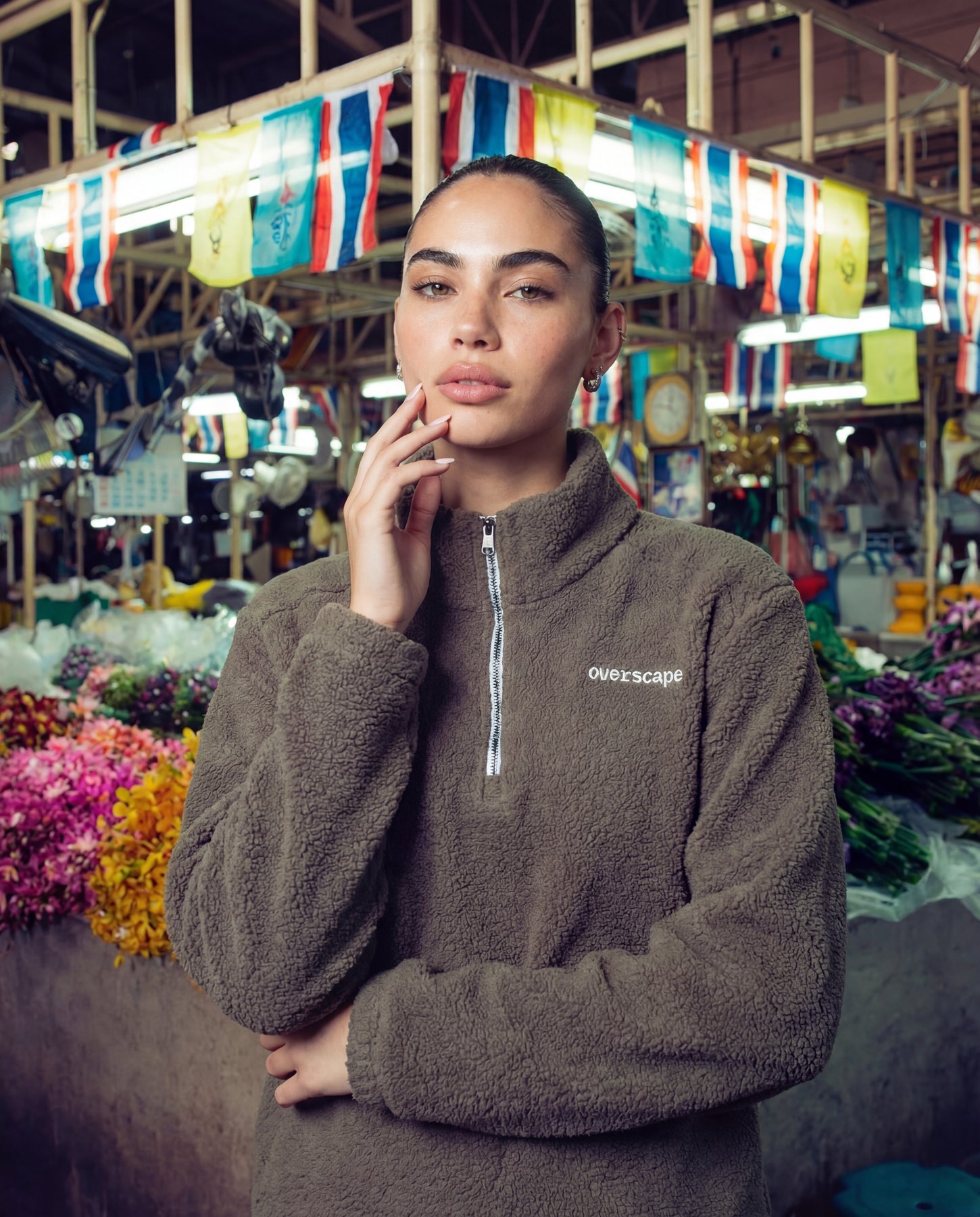 Soft fleece half-zip pullover with a relaxed boxy fit. Designed for everyday comfort, featuring an embroidered Overscape logo, adjustable zip neckline, and elastic hem with drawcord for a customizable fit. Warm, clean, and easy to style.